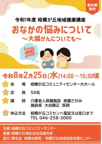 まちづくり・コミュニティ公開日:2026年01月11日相模が丘地域健康講座「おなかの悩みについて~大腸がんについても~」開催日:2026年02月25日(水)