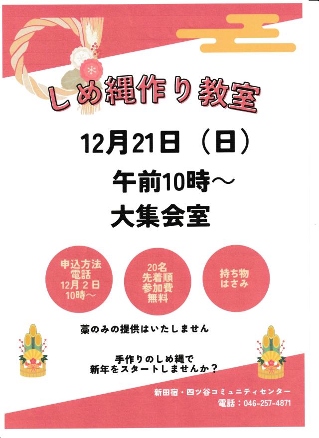毎年恒例で人気の教室です 経験豊富で優しく指導してくださるので安心です 新年を手作りのしめ縄でスター...