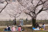 桜の名所は近場にもあります。写真は、海老名市目久尻川沿いの北部公園の桜を楽しむ人たちです。